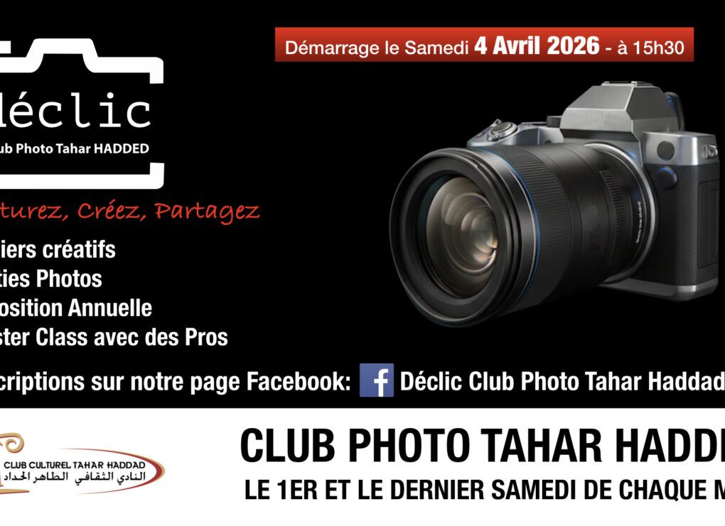 Première séance prévue le 4 avril 2026 Une nouvelle dynamique culturelle voit le jour au cœur de la Médina de Tunis.Le Club Photo Centre Culturel Tahar Hadded – Déclic lance officiellement ses activités au sein du prestigieux Centre culturel Tahar Hadded, espace emblématique de création et de réflexion. Ouvert à toutes et tous, le club […]