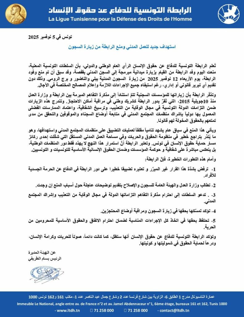 Dans un communiqué publié le 5 décembre 2025 et signé par son président Bassem Trifi, la Ligue tunisienne de défense des droits de l’homme (LTDH) dénonce l’interdiction faite à une délégation de la Ligue d’effectuer une visite programmée à la prison civile de Gafsa. D’autres délégations avaient déjà été empêchées le 12 novembre dernier de visiter les prisons de Belli, Nadhour et Borj Erroumi, et ce sans aucune justification malgré le respect de toutes les procédures administratives.